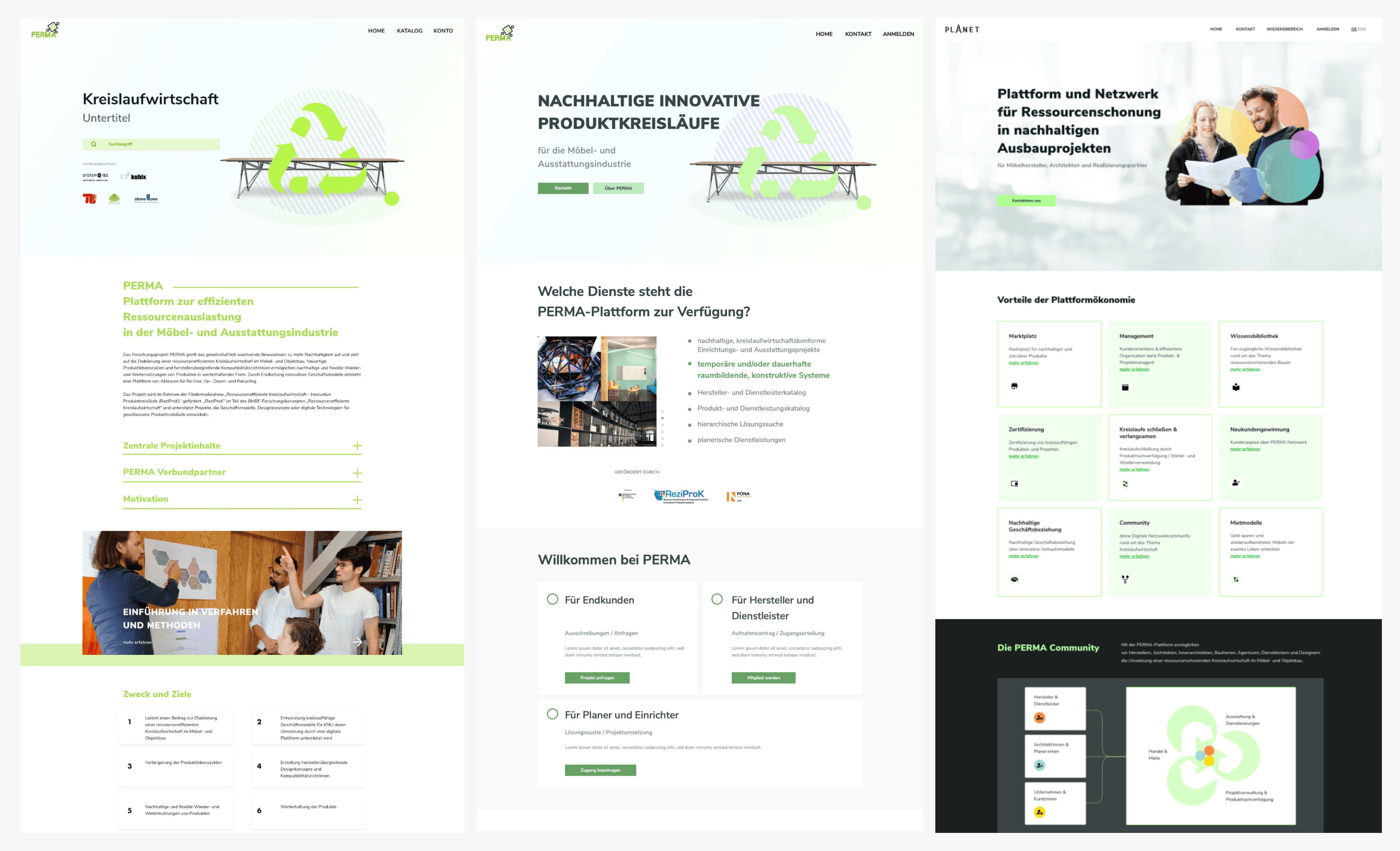 The landing page served as the entry point for PERMA, a B2B platform focused on sustainability and collaboration. It introduced the project's mission while providing non-logged-in users with access to essential elements: a catalog of core functionalities, project overviews, and contact information. The design prioritized clear navigation and visual consistency, laying the foundation for a platform that fosters sustainable practices and seamless collaboration.